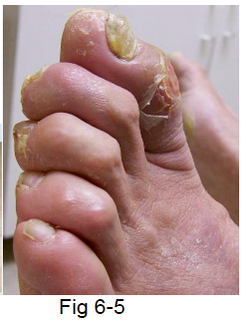 When the toes rotate, the nails may dig into adjacent toes—acting like a knife and producing small ulcers (see Fig. 6-8). Pointed shoes can crowd the toes and increase friction between them, leading to soft calluses developing in the spaces between the toes (see Fig. 6-9). These calluses are particularly dangerous if they become infected. The infection can then spread rapidly through the tendons of the foot (see Fig. 6-10).